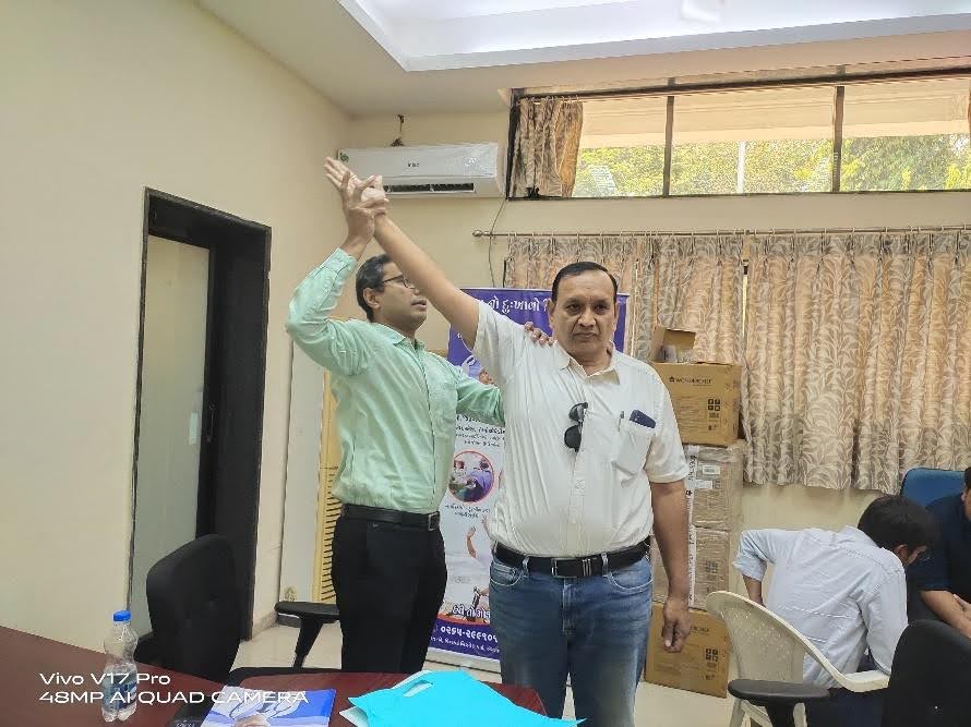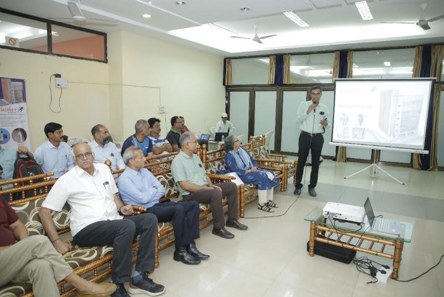 A medical camp was organised on April 9,2024 supported by ONGC. Dr Jaimeen Jesalpura from Vaishvi Hospital gave an informative presentation on arthritis management, ergonomics, diet plan and conducted bone density screening, demonstrated some physiotherapy exercises and some examinations of the participants.